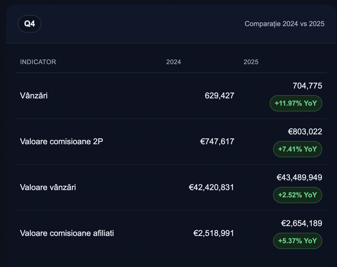 → Bugetele de marketing intermediate de platforma noastră (comisioanele afiliaților) au fost de €2,654,189 (în creștere cu 5.37% YoY), iar comisionul de rețea de €803,022 (în creștere cu 7.41% YoY)