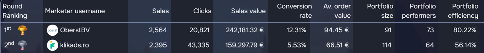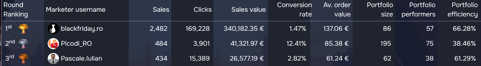 Switching to some leaders now. In Companies, it’s the skills of OberstBV and klikads.ro that have been surfacing lately. Just a couple of hundreds sales separating them, but a pretty large gap in terms of Portfolio Efficiency. Whatever their sales objectives were for this Black Friday, they are both on track to make the leap to Corporations next round.