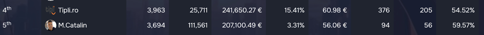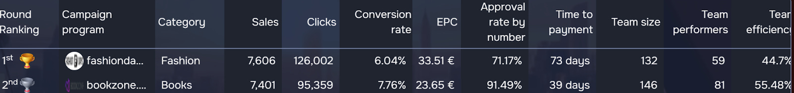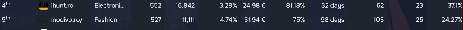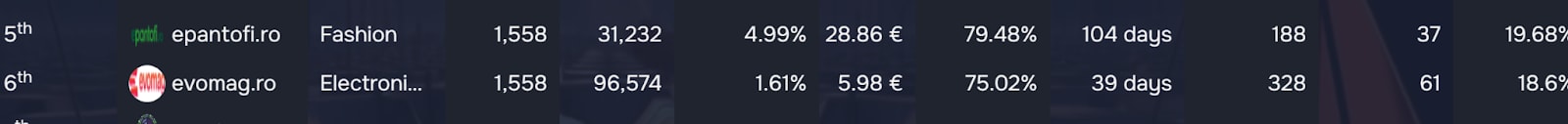 In Companies, bestvalue.eu is enjoying leading the pack with Unicorn-worthy metrics very soon. Meanwhile, there’s an exciting showdown between epantofi.ro and evomag.ro, where sales figures are nearly identical. The traffic used to get to those sales however is a whole different story. It’s take evomag basically 3x the clicks. Nothing wrong with that, it only goes to show that, in the Business League, there’s more than one path to success.