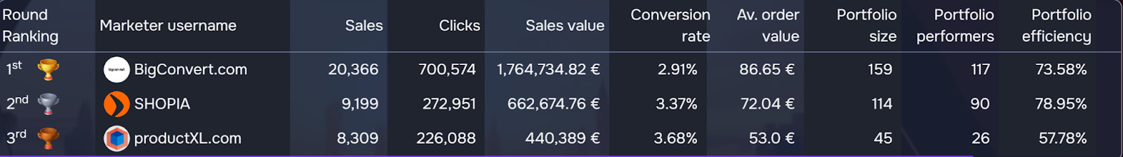 Unicorn Marketers have been thriving lately, with vast portfolios under their belts. BigConvert is back to its dominating ways, but we’re seeing a compelling face-off between SHOPIA and productXL.com. All three have pretty much settled here, in the Unicorns realm, and their stats suggest there’s still much to be done this round.