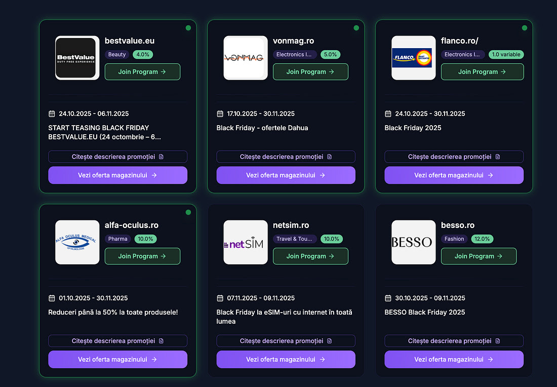 Vezi cine intră în scenă de Black Friday, cele mai noi programe de afiliere din BusinessLeague și un podcast fresh despre performanță în marketing & e-commerce.