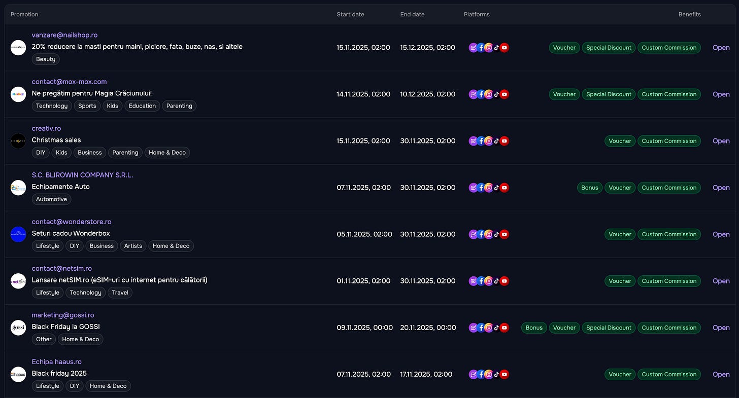 Primele campanii sunt deja active în BusinessLeague. Magazinele pot urca oferte dedicate pentru influenceri, iar creatorii de conținut pot începe să monetizeze imediat.