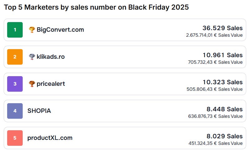 Black Friday (7–9 nov) a fost un adevărat campionat în BusinessLeague: 62.000+ vânzări, 4,4 mil. € generate și o conversie de 6,4%. Vezi topul categoriilor și advertiserii care au dominat weekendul!