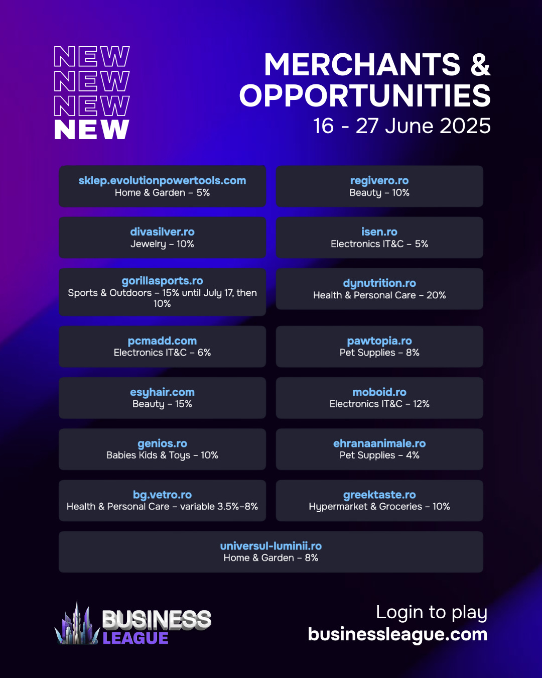 Află cum a reuşit Bogdan Popovici să depășească 1.000 de vânzări lunar, descoperă lista completă de advertiseri noi din iunie și rezervă-ți locul la evenimentele BusinessLeague (online & București).