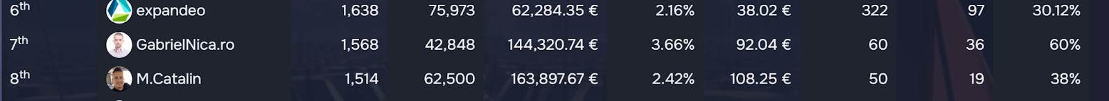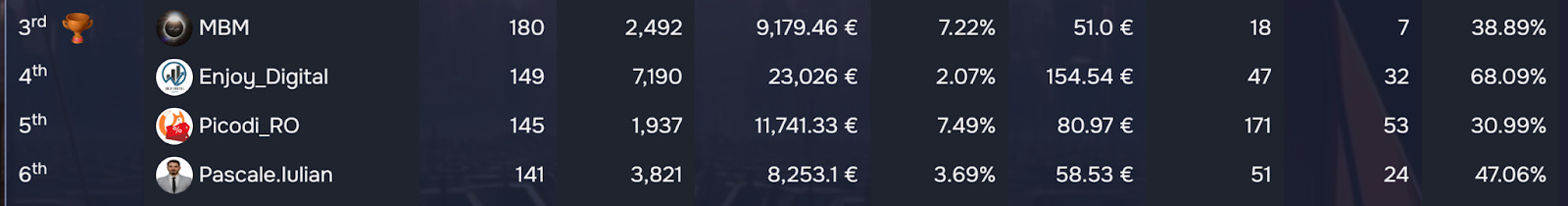 The Start-Up Marketers may obviously not be delivering numbers at a Unicorn level, but they do have their battles that we keep an eye on. For example, in 4th and 5th places we have Enjoy_Digital (that’s actually been the subject of one of our Spotlight editions) and Picodi_RO who’s been a solid Company in the past rounds. Both these Marketers are now trying to get ahead, while we approach the middle of the round.