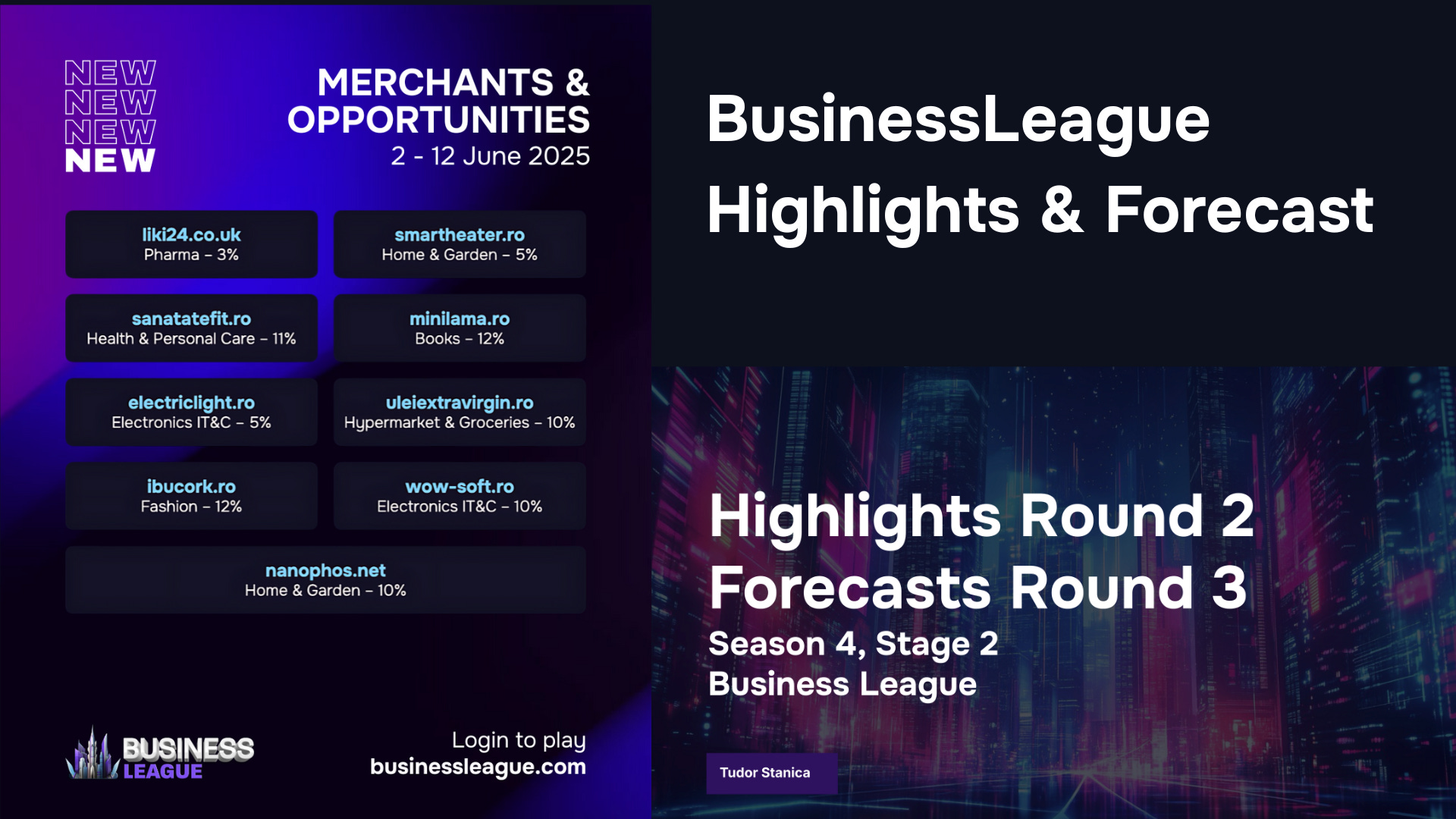 La BusinessLeague Highlights din 10 iunie, Tudor Stănică a prezentat cele mai importante rezultate și evoluții din Runda 2 a sezonului 4, oferind totodată previziuni pentru Runda 3.