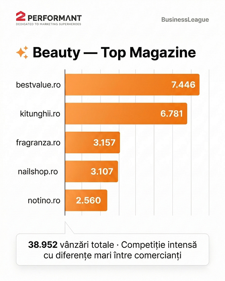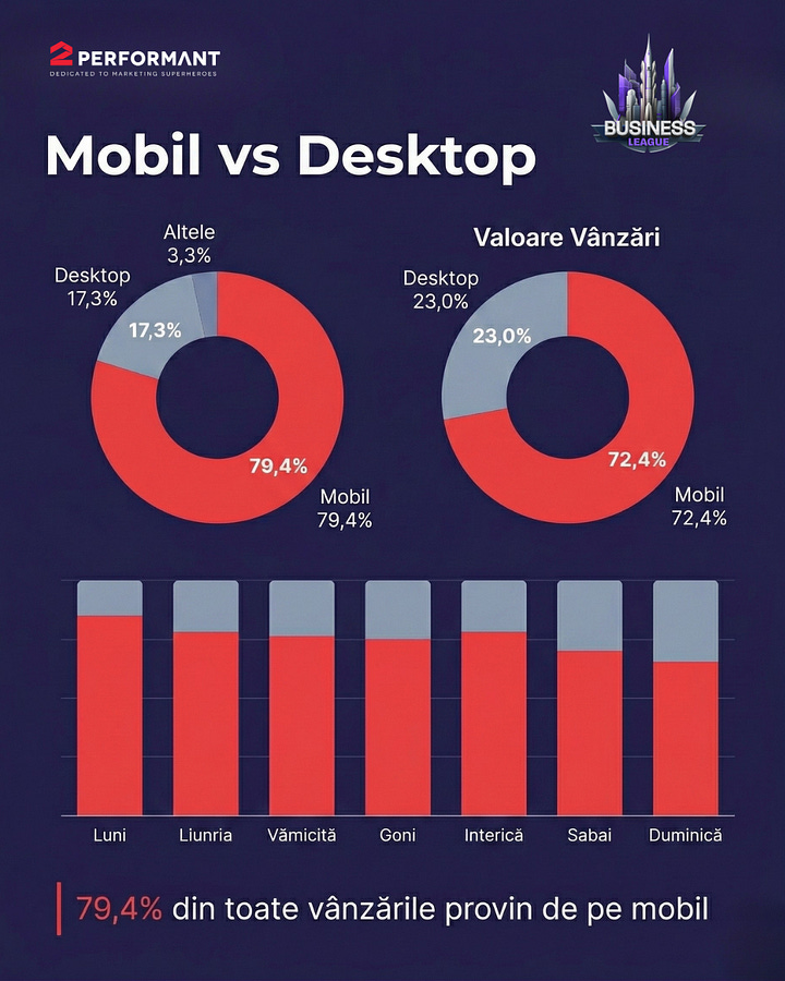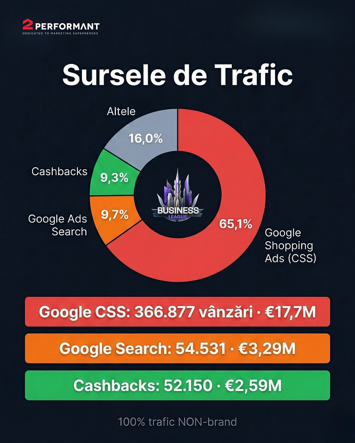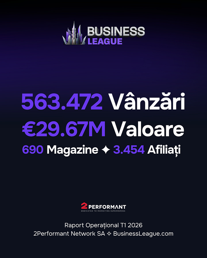 Tot în martie, ROAS-ul în BusinessLeague by 2Performant a ajuns la 11.14x. Exclusiv din trafic non-brand. Media globală a industriei stă la 2.87x. Citiți de două ori, dacă e nevoie.