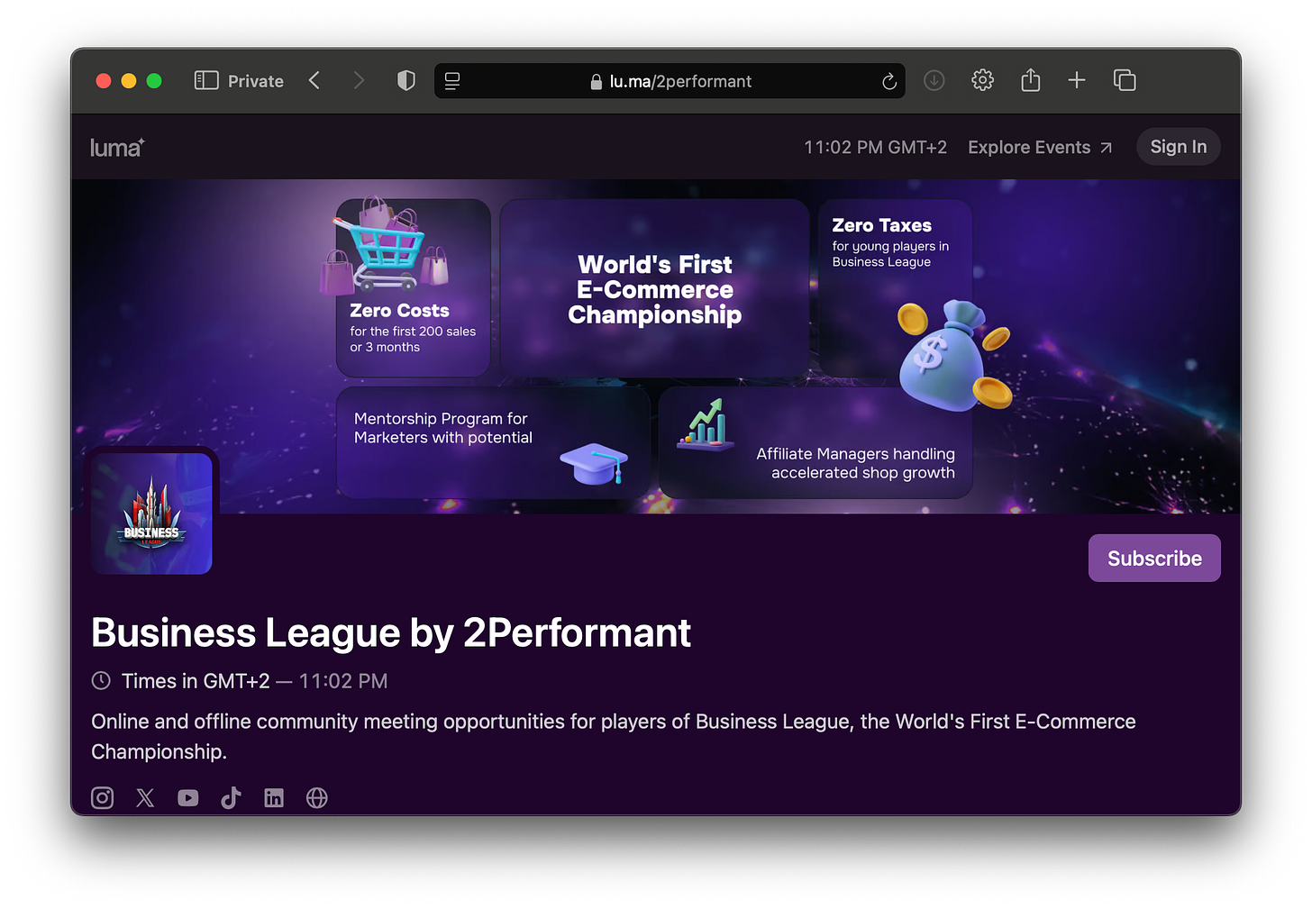 All our events have now moved permanently to Lu.ma/2performant. This platform offers online and offline community meeting opportunities for players of the World’s First E-Commerce Championship.